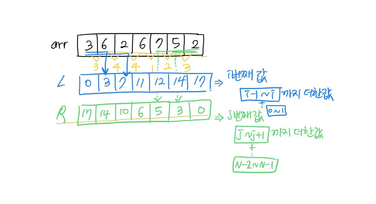 Left쪽에서의 누적합들과 Right쪽에서의 누적합들을 미리 구해두고, 그 사이 관계를 이용하겠다 이거지요~!