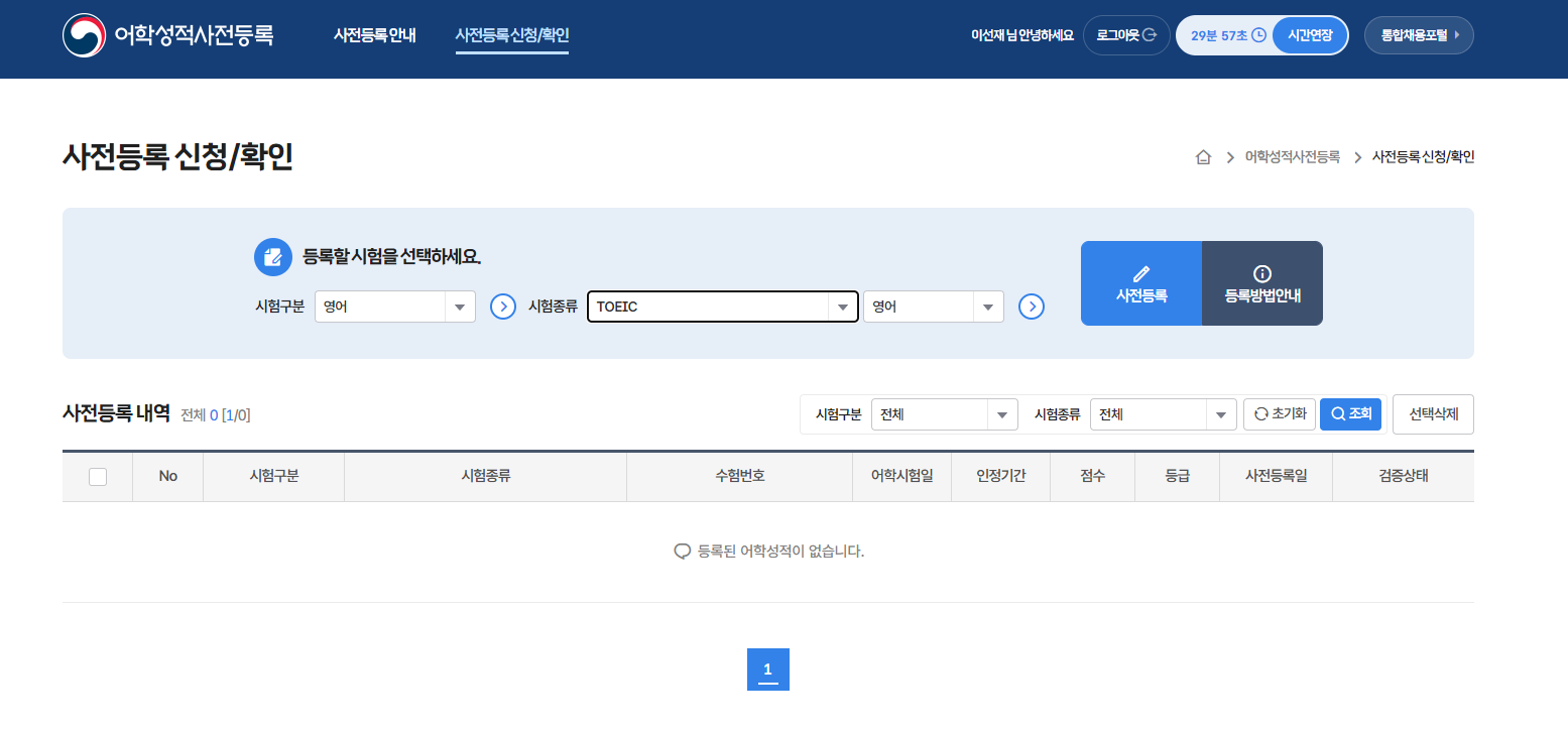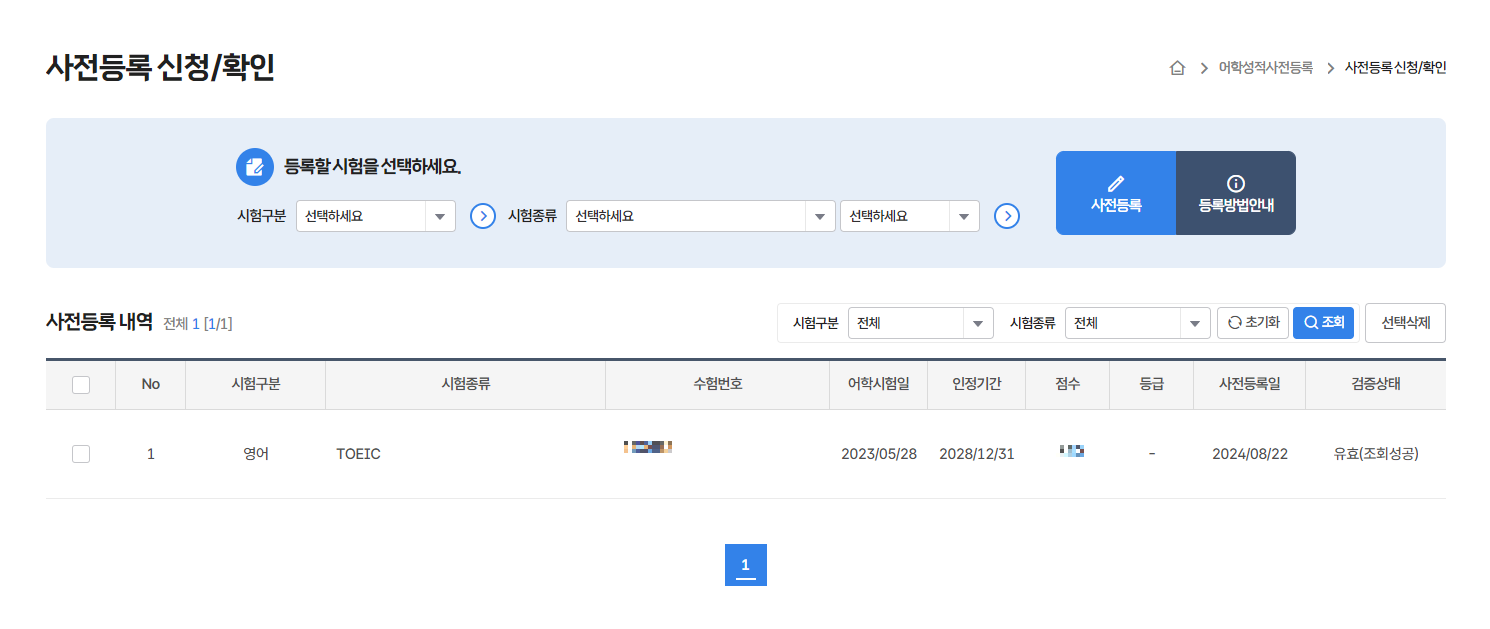 * 이때 등록하는 성적의 유효기간이 남아있어야 해요!!! 지난 시험은 조회되지 않고, 등록도 불가합니다